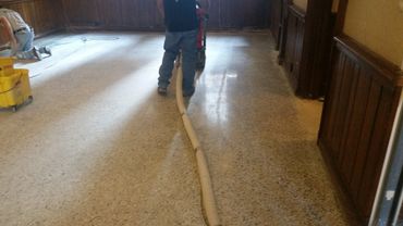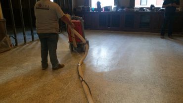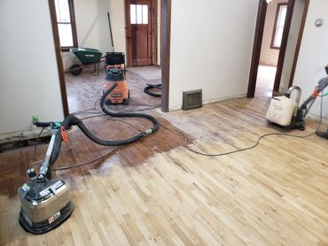 In this video is the method known as drum sanding. This is the removal of deep stains, surfaces scratches, surface coatings, and uneven areas. This must be done correctly so that the species’ grain will be restored. This is one of the hardwood floor’s main features. The particles and dust produced by the sanding process are then collected by an industrial vacuum. Next multiple color coats are applied to bring the life back to your floor and a polyurethane sealer is applied to th